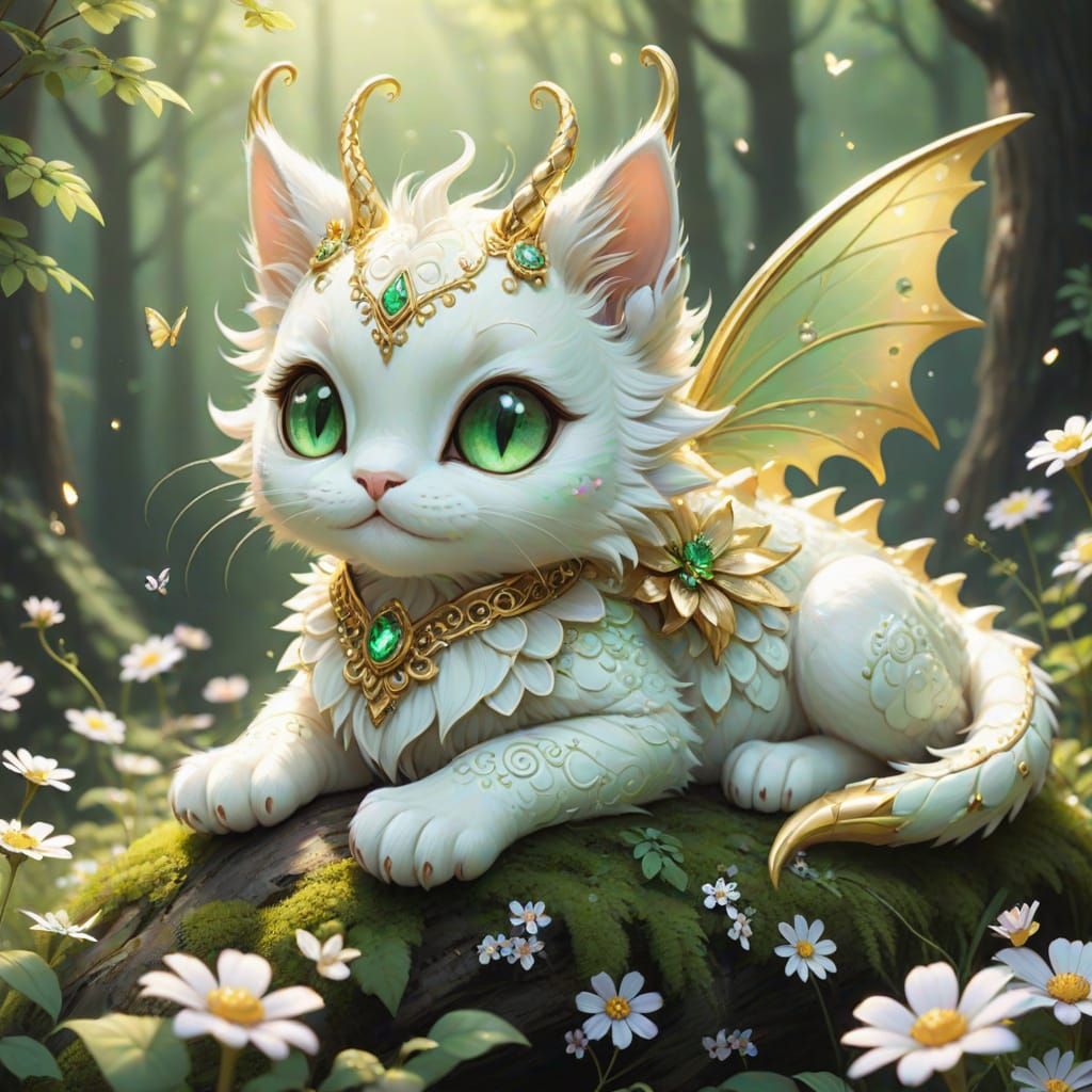 This image shows a surreal and imaginative hybrid creature, a baby cat dragon with soft white fur and golden accents, resting in a gentle forest. The artwork is rendered in a realistic anime style.
