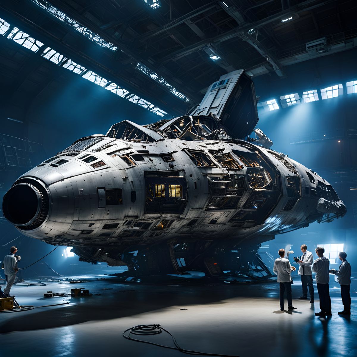 This image shows scientists inspecting a crashed spaceship within a hangar. The scene is lit with bright, volumetric lighting and rendered with photorealistic detail, reminiscent of a cinematic movie scene.