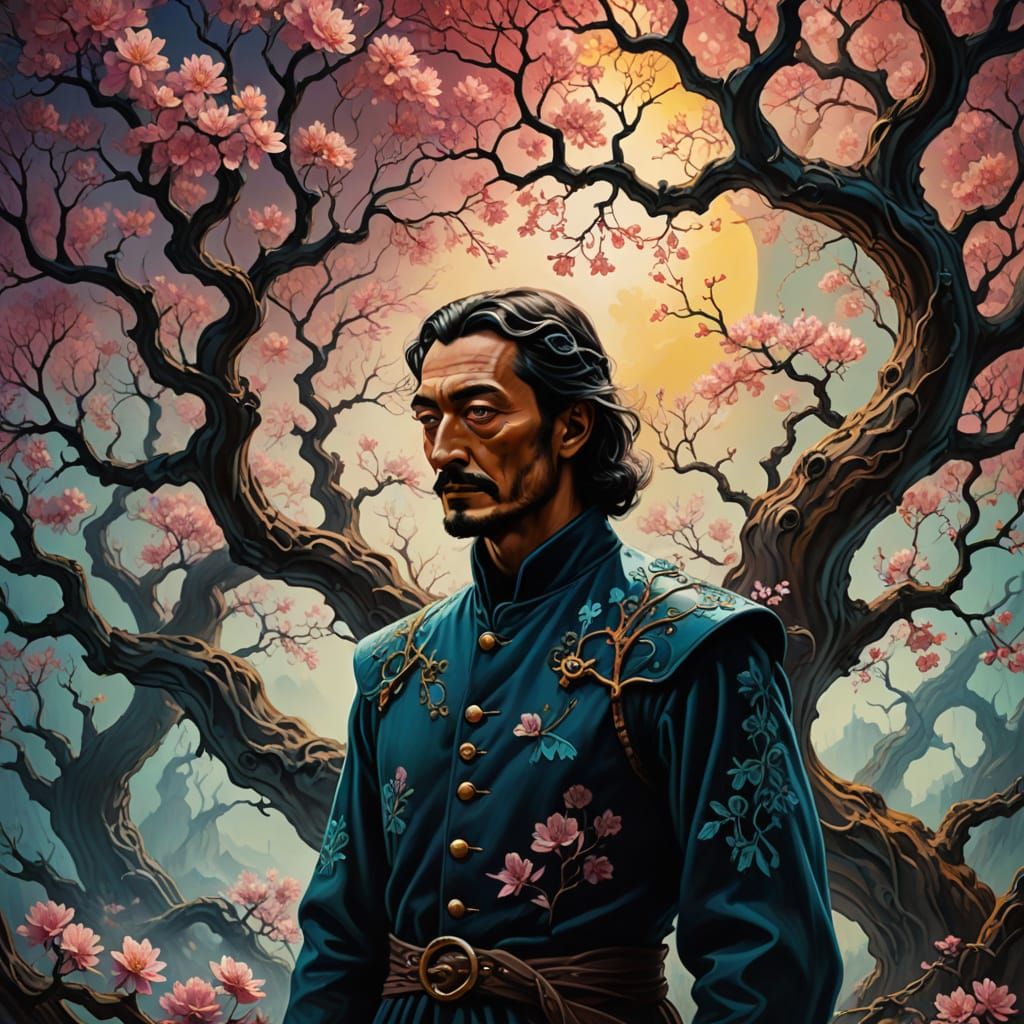 A dark fantasy illustration of a cursed soul and a mortal warrior standing together under a blooming Spirit Tree, surrounded by vibrant colors and intricate, glowing tattoos, evoking a sense of eerie mysticism and dark romance.
