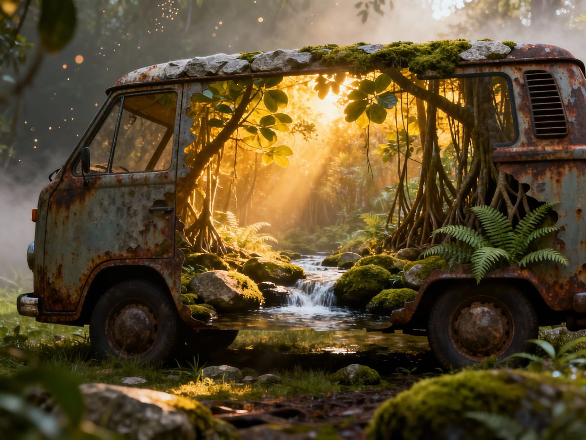 This hyperrealistic digital artwork features a campervan profile with a glowing mangrove rainforest scene inside its silhouette. Golden sunlight filters through the canopy, creating a mystical and tranquil atmosphere.