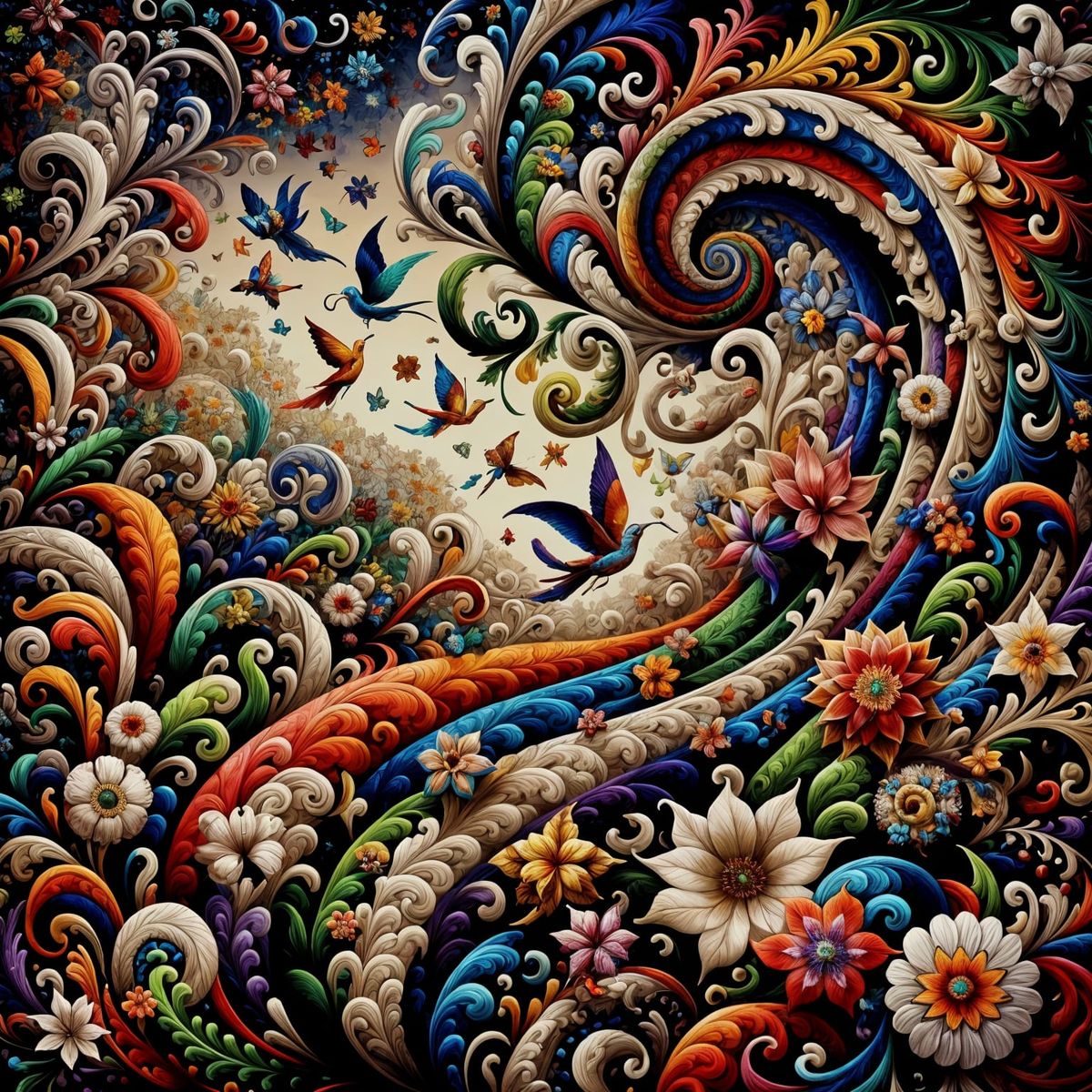 A vibrant arabesque pattern featuring elements from nature. The high-resolution image presents flowers, leaves, butterflies and birds in rainbow hues, rendered with high dynamic range.