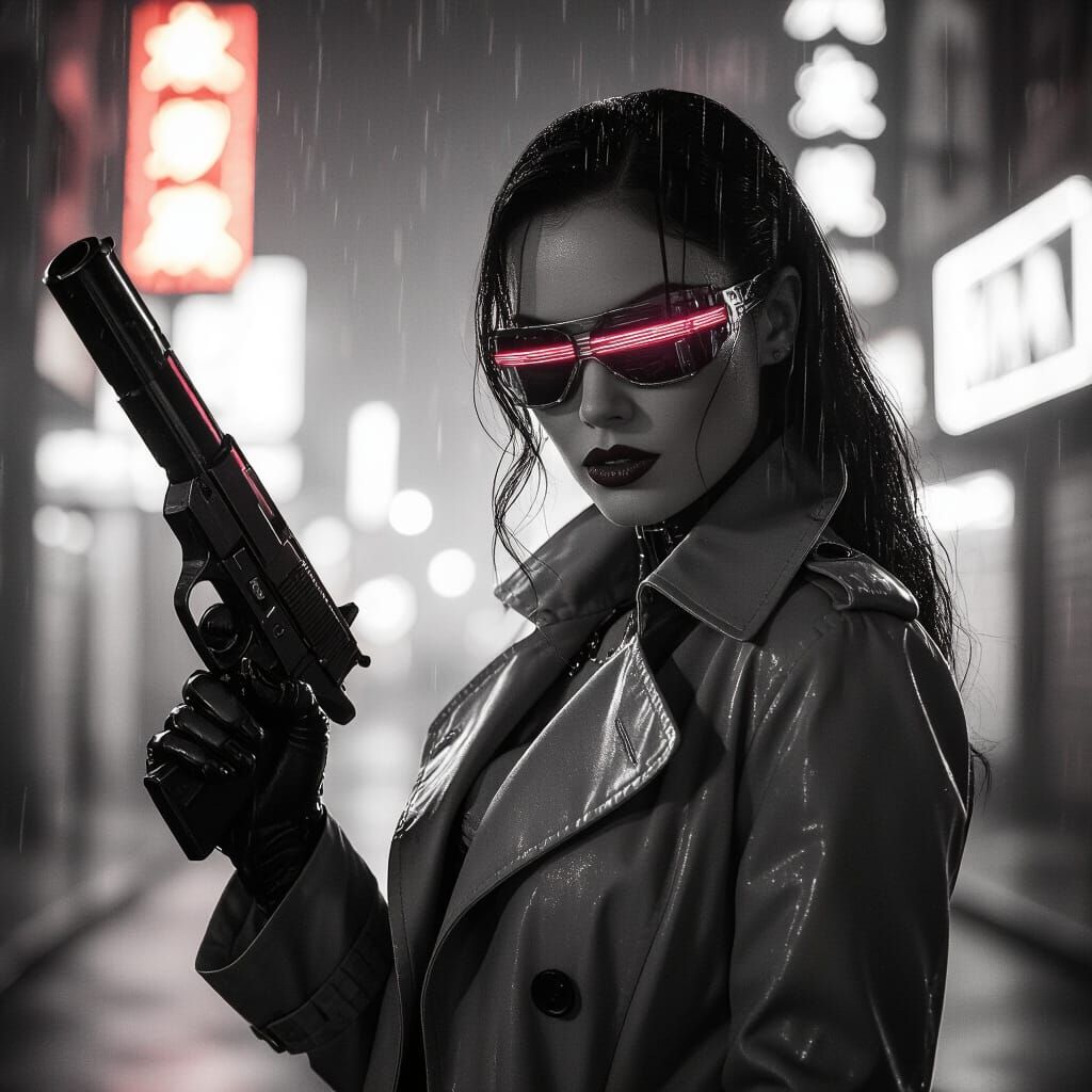 A noir-style image of a cybernetic woman with glowing eyes holding a ray gun on a neon-lit, rainy street. Features cinematic lighting and selective color.