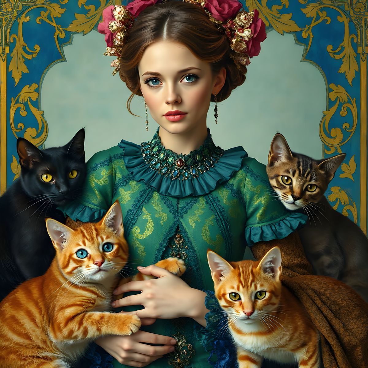 A vibrant digital painting of a beautiful woman with blue eyes, light brown hair, and a colorful dress. The artwork depicts her as the 'Queen of Cats'.