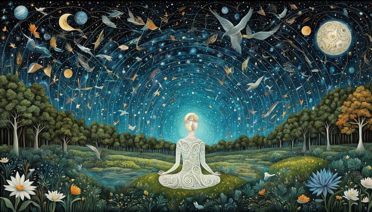 This image is a vibrant digital collage that combines elements of nature, abstract designs, and a textured network, evoking a sense of change, resilience, and cosmic connection.