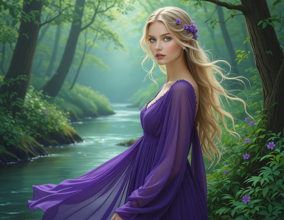 This image shows a blonde woman with blue eyes in a purple dress standing in a forest next to a river. The image suggests a blend of realism and ethereal fantasy, reminiscent of classical and art nouveau styles.