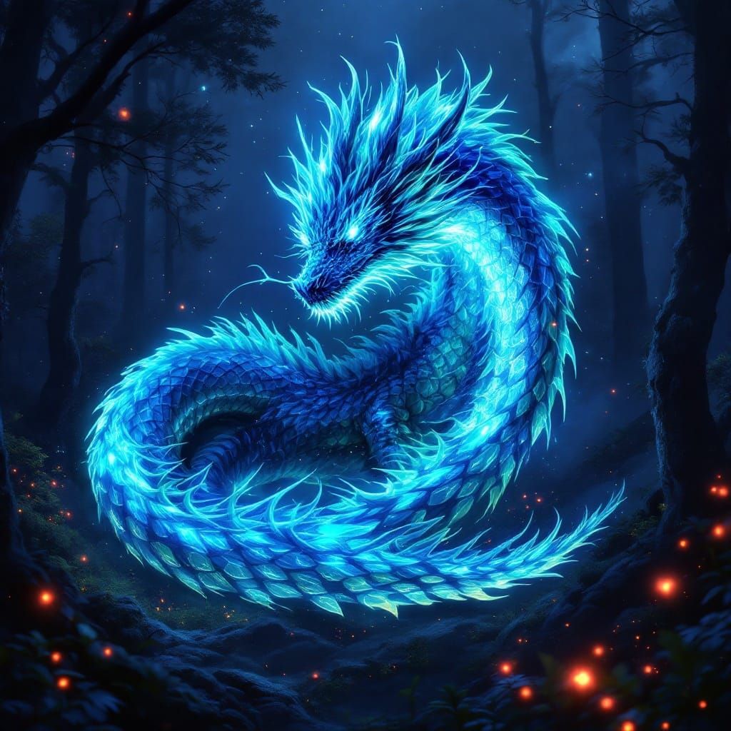 This image depicts a majestic dragon with iridescent, glowing scales against a dark forest backdrop, evoking a sense of wonder and otherworldly energy, reminiscent of fantasy concept art and hyper-realistic oil paintings.