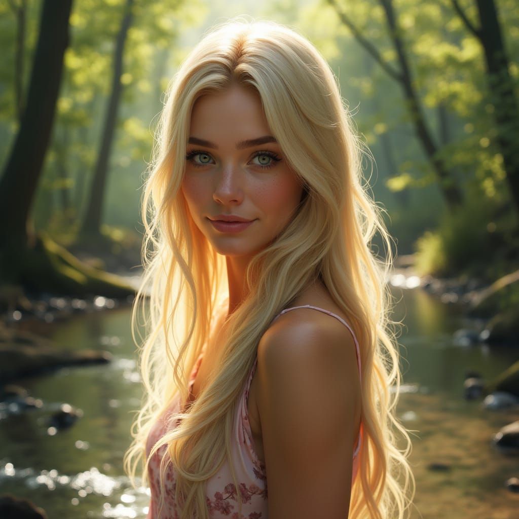 A portrait of a beautiful young woman with long blonde hair and blue-green eyes in a pastel dress, set in a sunlit woodland. Features intricate details, vibrant colors, and soft lighting.