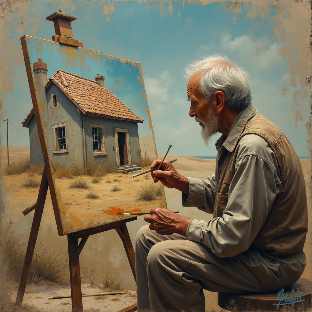 um homem de 85 anos, de origem saudita, usando roupas surradas de pintora manchadas de tinta, está concentrada em pintar uma casa em meio a uma paisagem desértica. Sua expressão transmite serenidade e foco enquanto ela retrata a cena. O ambiente ao redor é frio e inóspito, dentro de uma prisão violenta. ...