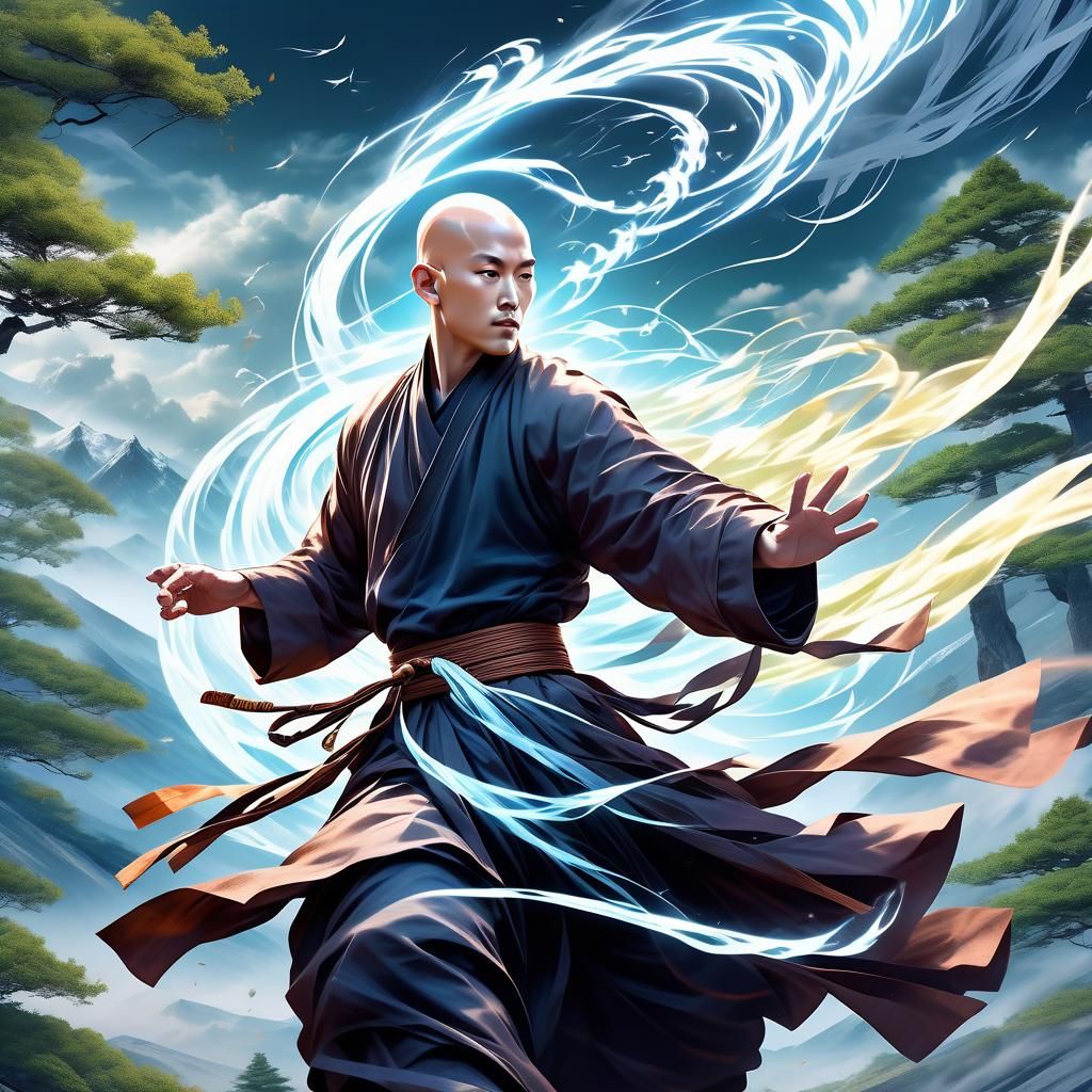 A striking picture of a bald young monk controlling wind. Translucent, spiraling wind energy surrounds him as he strikes a martial arts pose on a forest mountaintop.