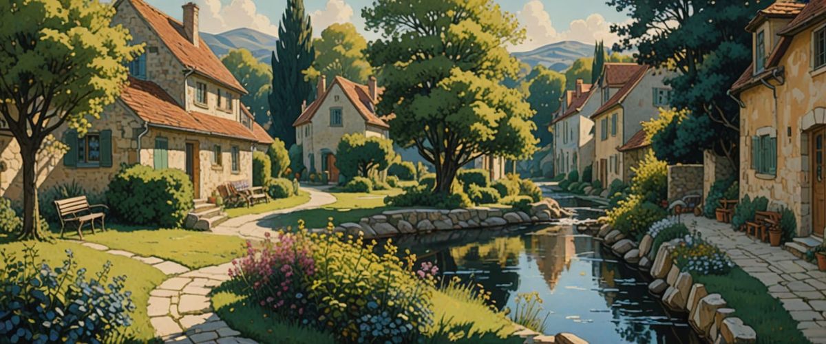 A sunlit village scene with stone houses, cobblestone streets, and a gently flowing creek. Rendered in a comic book style with watercolor and gouache, the image evokes a cheerful, bright atmosphere.