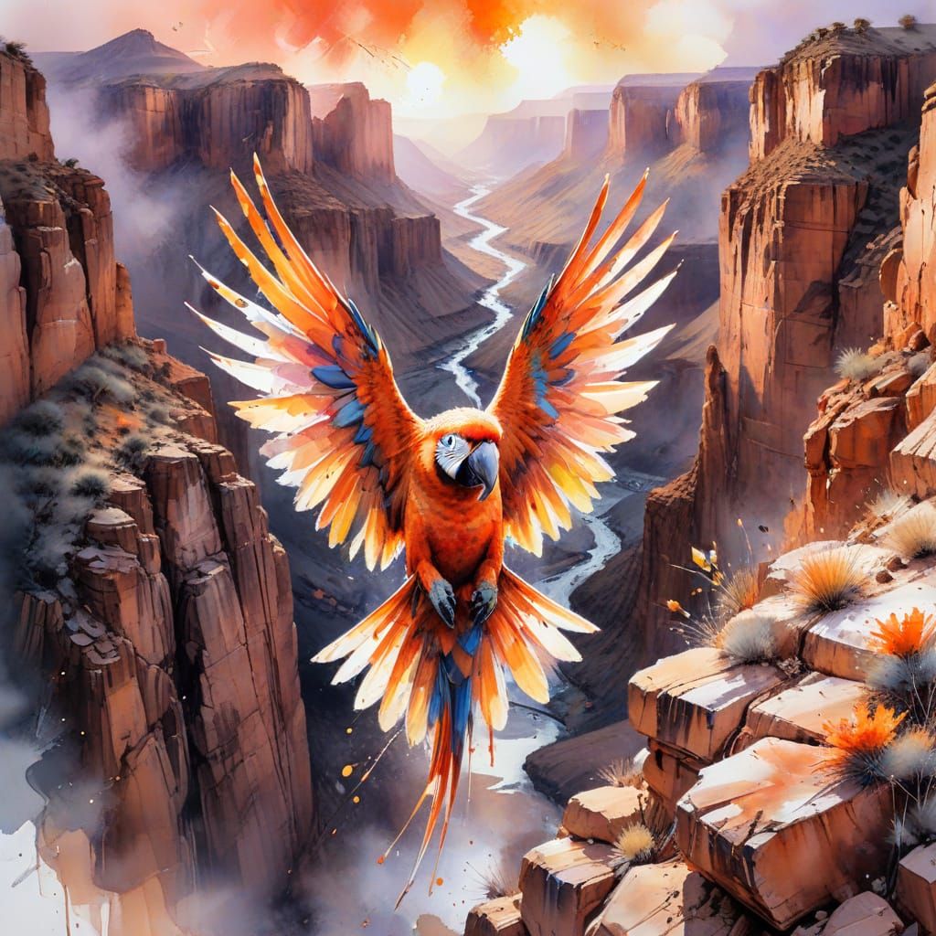 This image captures a vibrant parrot soaring over a dramatic sunset canyon with orange rock formations, rendered with expressive watercolor splashes and explosive colors.