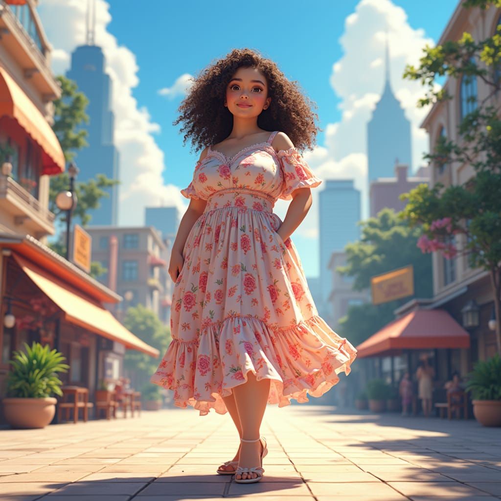 This stunning image features a confident young woman wearing a colorful summer dress, set against a lively urban backdrop with eclectic shops, street art, and towering skyscrapers, infused with intricate textures and dynamic lighting, reminiscent of anime and 3D concept art.