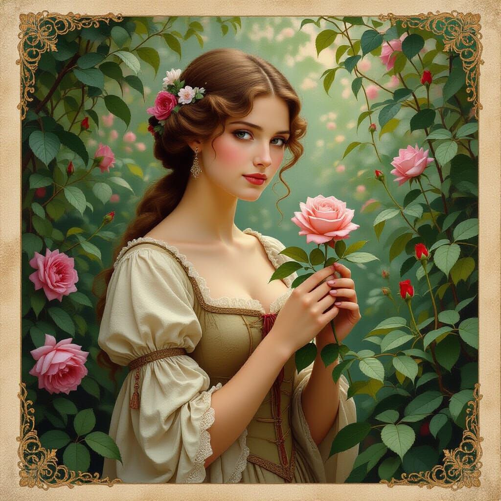 This image depicts a Renaissance lady holding a rose in an overgrown garden. It features muted earth tones and an aged paper texture, evoking Romanticism art.