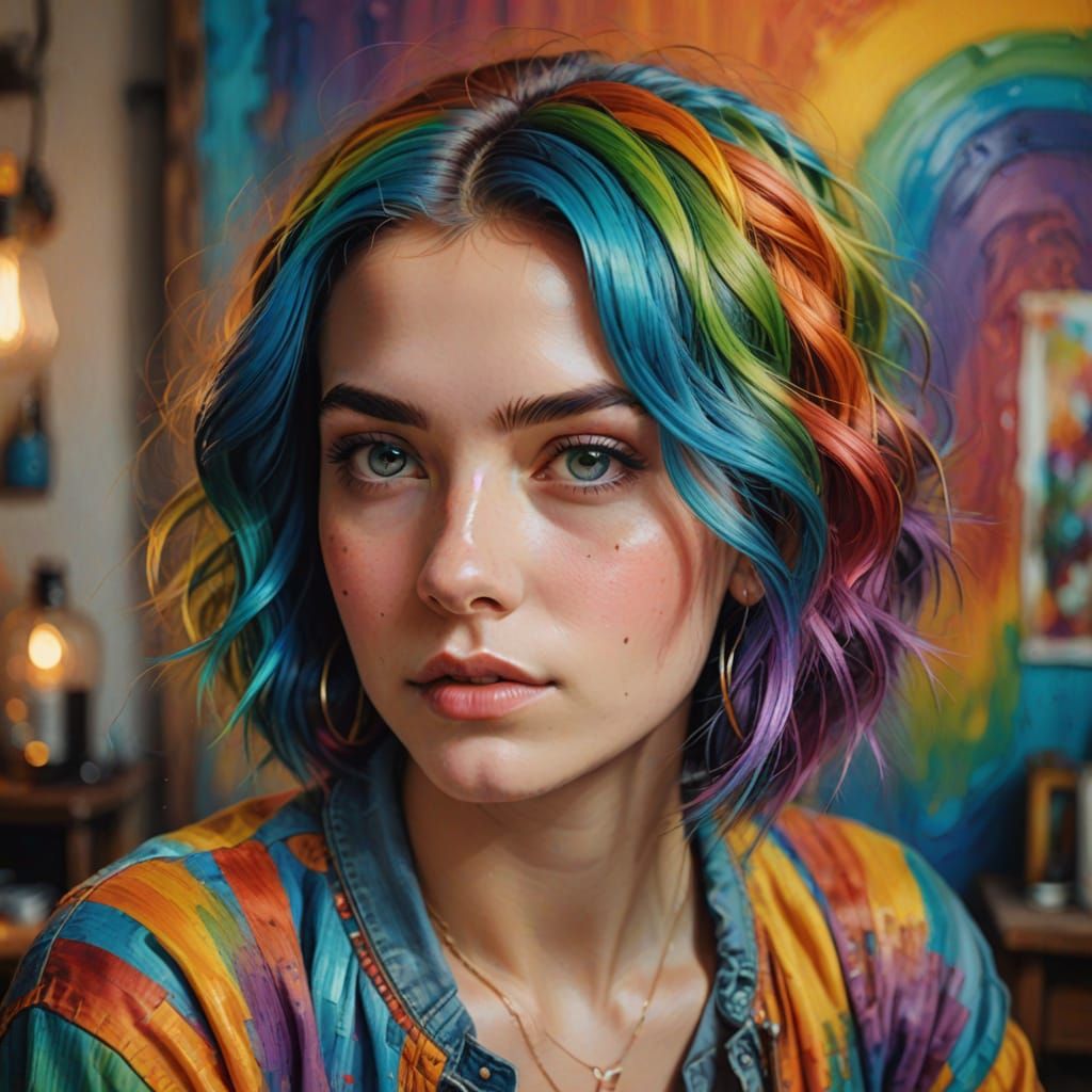 This image is a close-up portrait of a young woman with a striking rainbow hairstyle, set against a colorful and glowing background in a bright studio. The painting features expressive brushstrokes and detailed textures in a bohemian style.