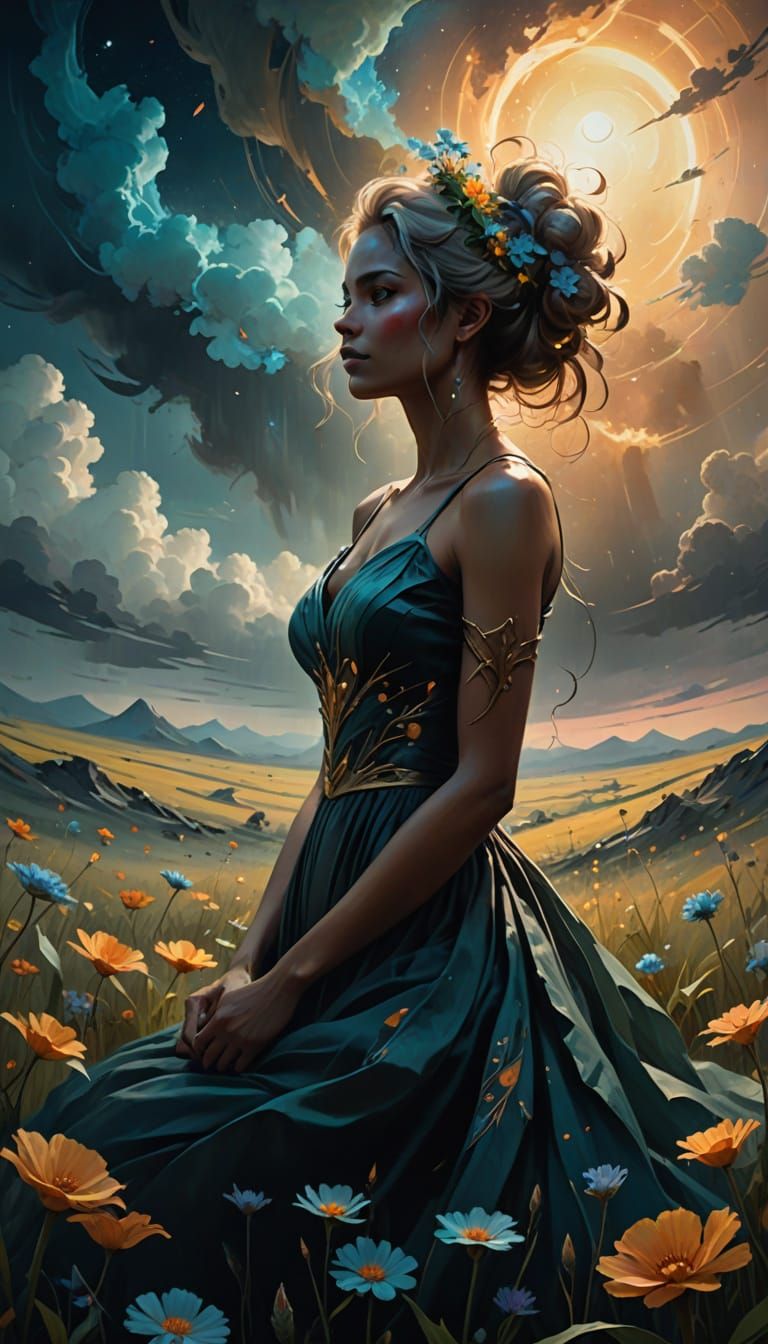 This oil painting depicts a celestial wanderer named Soraka resting in a flower field. Rendered in an Abstract Neoralism style with moody, earthy colors and vivid highlights.