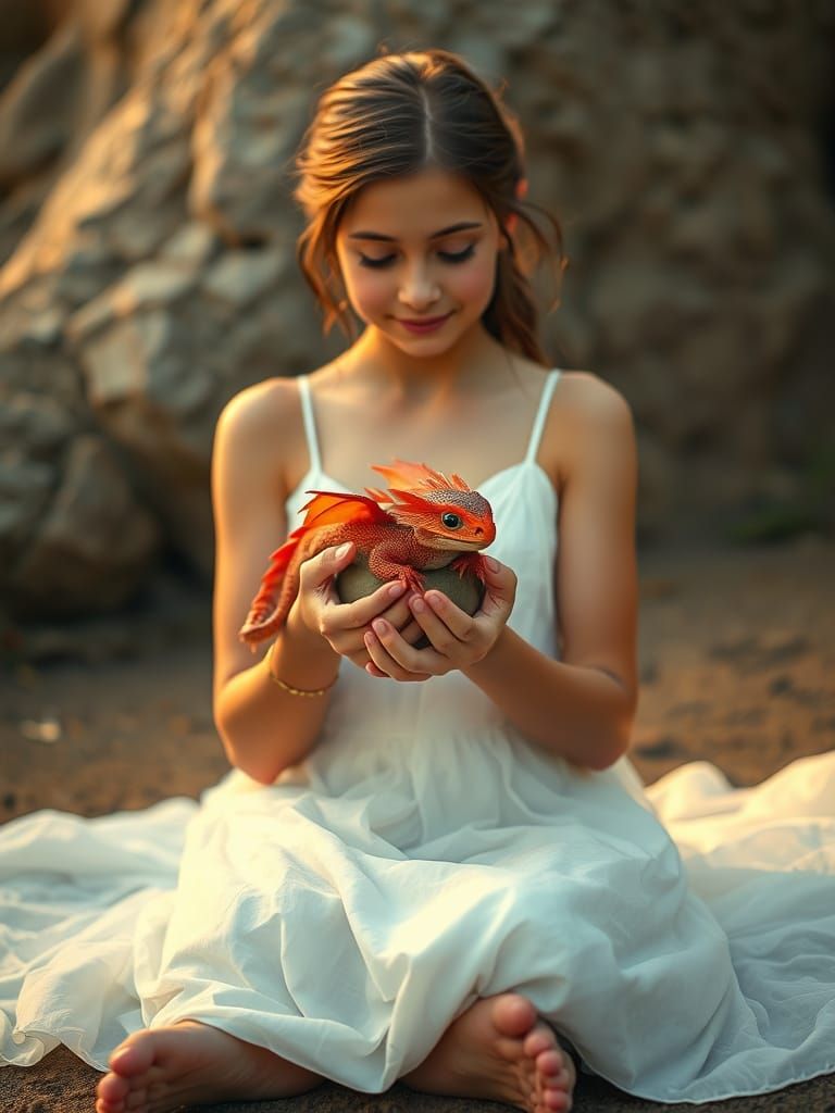 This image captures a serene moment of a young woman tenderly holding a small, colorful dragon, bathed in warm cinematic lighting, with a subtle film grain and soft focus, evoking a sense of enchantment and mystique, reminiscent of epic fantasy and drama.