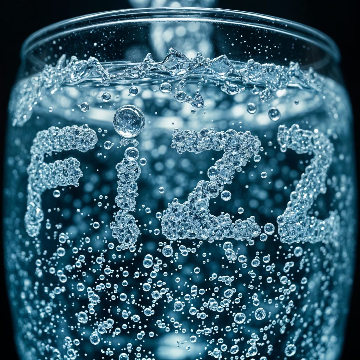 This image shows the word "FIZZ!" formed from fine, distinct sparkling water bubbles, floating in a large glass of sparkling water. The image features volumetric lighting effects and a cinematic aesthetic.