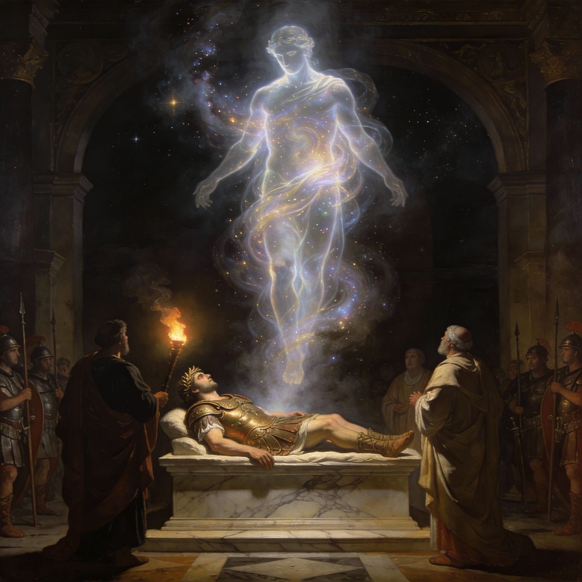 This image depicts a Roman emperor's soul ascending from his dying body, surrounded by priests and soldiers. Rendered in a luminous, painterly style with chiaroscuro lighting, it captures a solemn transformation.