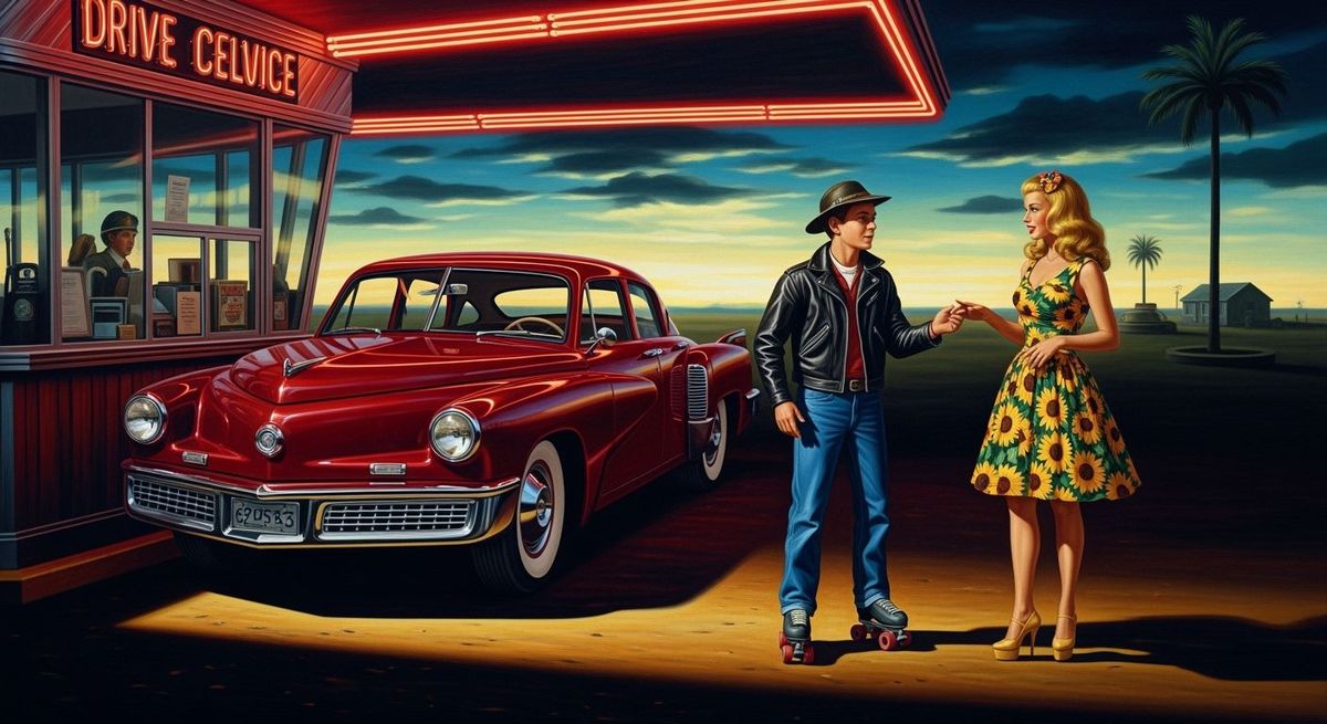 This image presents a surreal, dreamlike interpretation of a 1950s drive-through diner. It features a vintage car, roller-skating boy, and golden-haired girl, highlighted by vibrant colors and dramatic lighting in an otherworldly atmosphere.