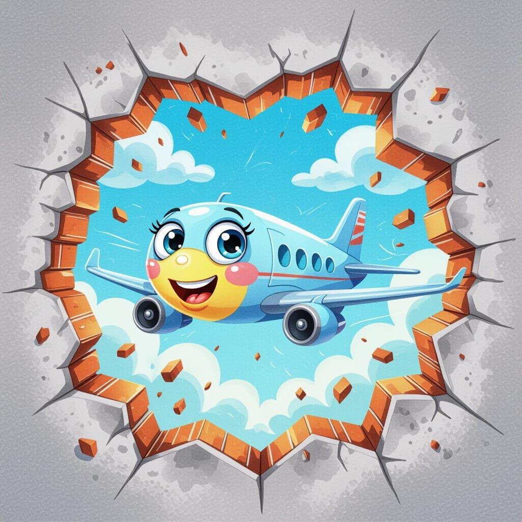 This watercolor illustration features a cheerful cartoon airplane with large eyes, emerging from a cracked cloudy wall into a bright blue sky. The scene is rendered with vivid, glossy colors.