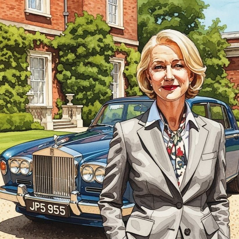 This alcohol ink painting captures Helen Mirren at 40, smiling beside a vintage Rolls Royce at an English manor. The 1970s scene features warm light and flowing colors, evoking Corot and Monet's atmospheric style.