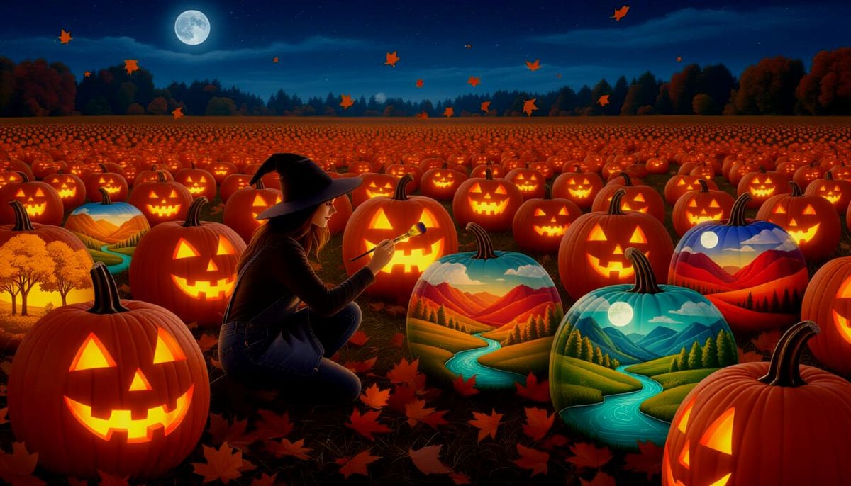 This image depicts a magical autumn night where an artist paints living landscapes onto glowing pumpkins. Scenes sprout to life, creating a whimsical, transforming gallery of fall wonder.