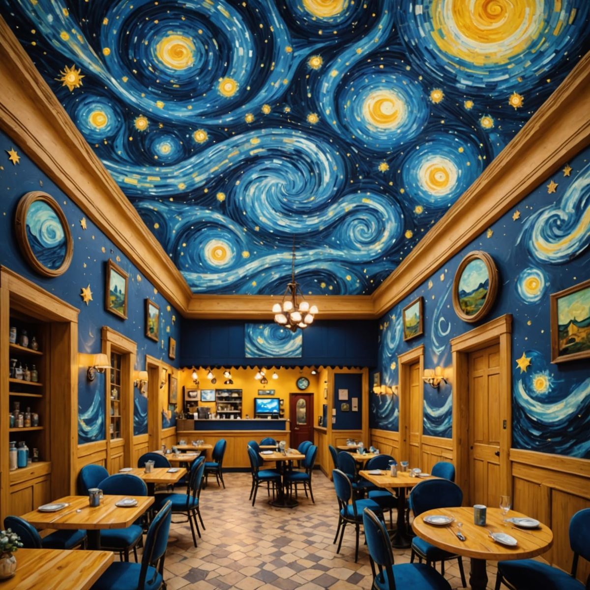 Easily design your own magical cafe interiors, inspired by Van Gogh's night sky. Free and simple AI image generation.