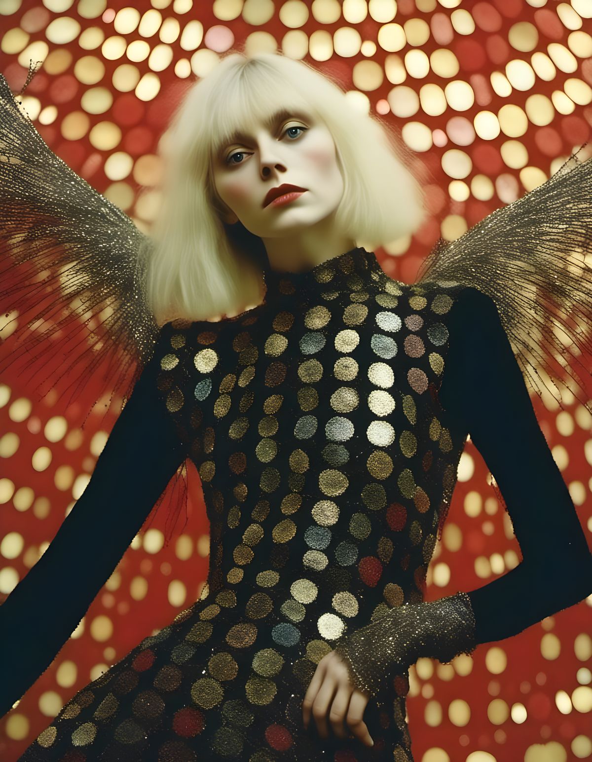 A glossy image of a glamorous woman with a blonde bob haircut standing on a stage. This digital artwork incorporates a Klimt-inspired artistic style.