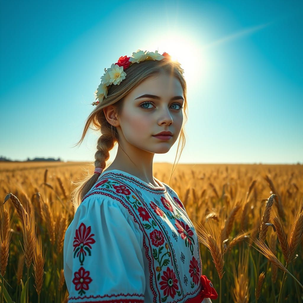 A striking picture of a girl in traditional Ukrainian clothing standing in a wheat field. The image features hyperrealistic textures, side lighting, and a clear blue sky, rendered with dramatic depth.