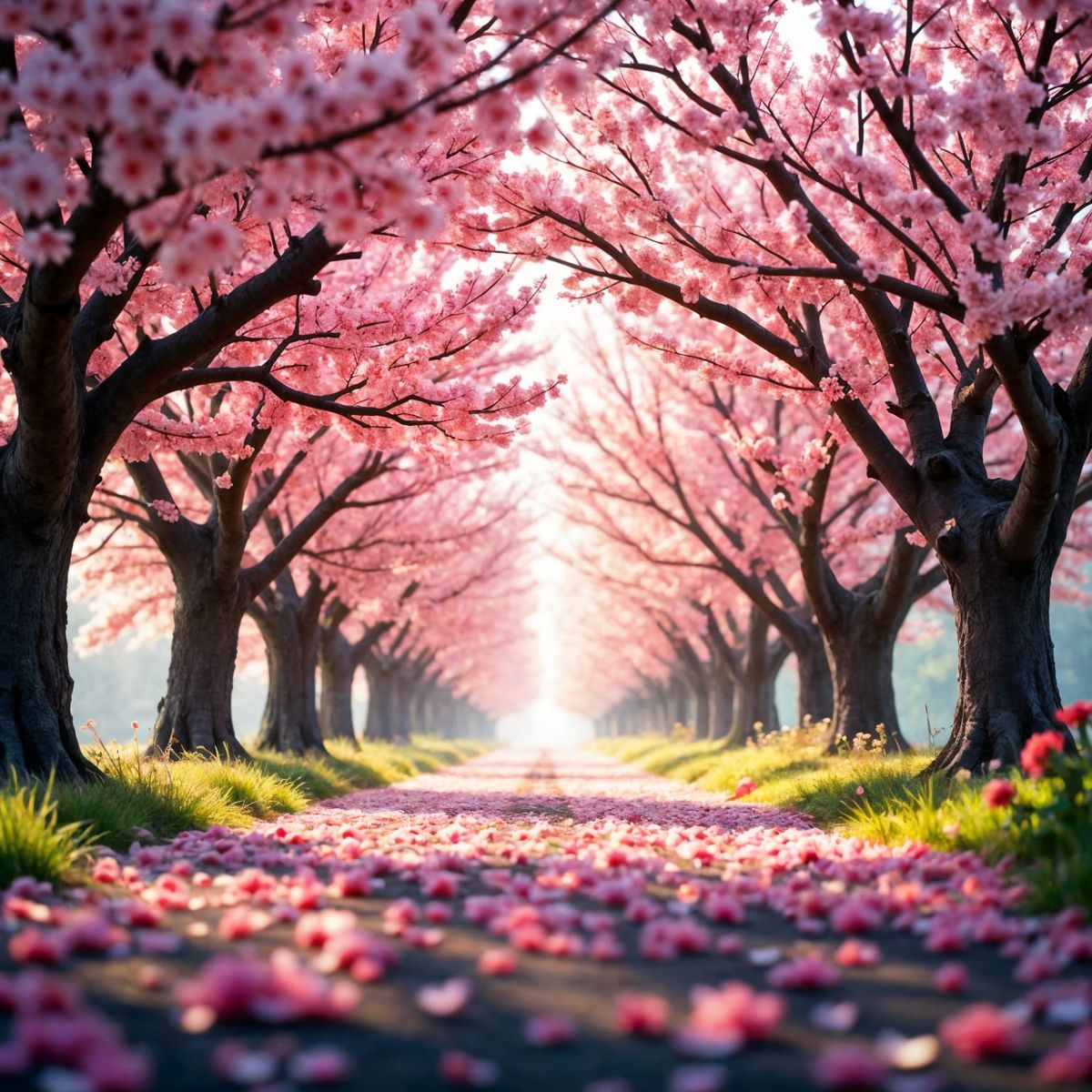 A breathtakingly beautiful film-style landscape of cherry blossoms in full bloom, captured with hyperrealistic attention to detail and cinematic flair.