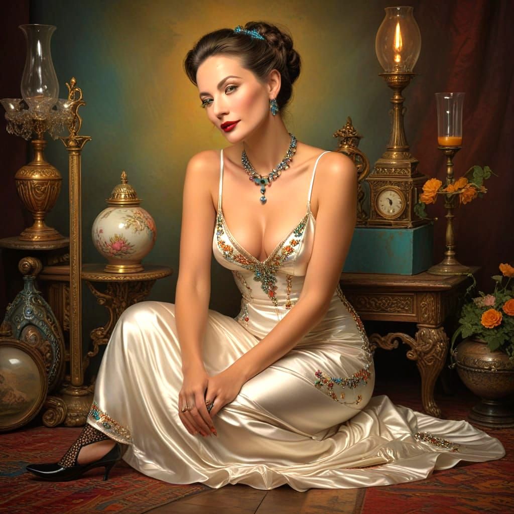 surreal incongruous fanciful whimsical scene with unexpected arrangement of incompatible elements in absurd bizarre composition; full-height image of lively magnetic captivating mature lady elegantly dressed in unusual multicolored retro-style outfit, natural graceful dynamic posture, ease of movement, ...