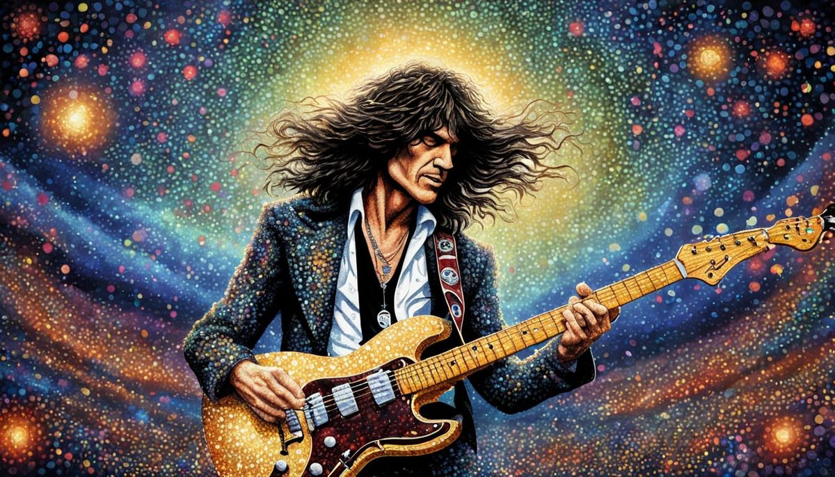 This image showcases a pointillist style artwork with a musical glow and an edgy feel, evoking the spirit of the song "Dream On".