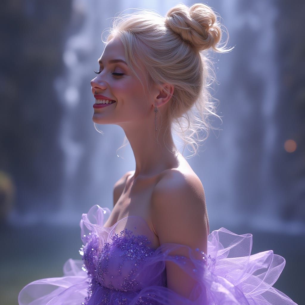 This image shows a blonde European woman with an elegant chignon, wearing a light purple dress. She smiles melancholically in front of a shimmering waterfall, rendered in a hyperrealistic style.
