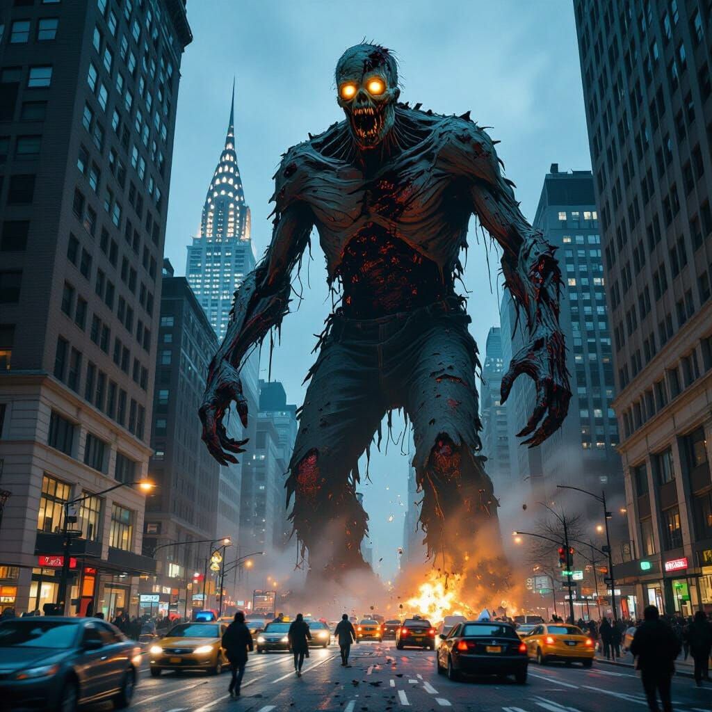 This image shows a massive zombie towering over city skyscrapers, causing destruction as people flee. The scene is rendered with realistic detail and cinematic lighting, emphasizing the chaos.