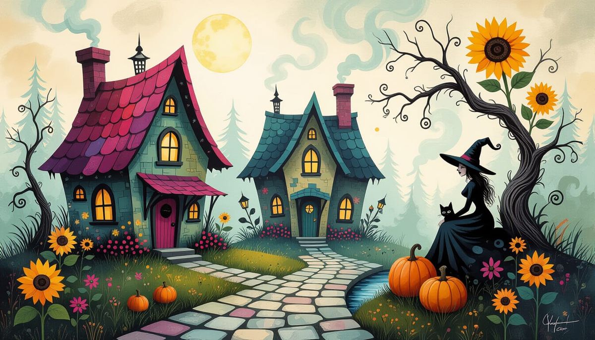 A detailed oil painting of rickety witch houses with crooked roofs, flowering yards, and twisted trees. Features a witch, black cat, and surreal, vibrant elements in a collage-like scene.