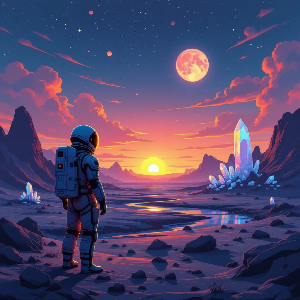 A lone astronaut surveys a barren alien world with crystalline structures and glowing flora under a binary sunset, rendered in a retro-futuristic surreal style with vibrant colors.