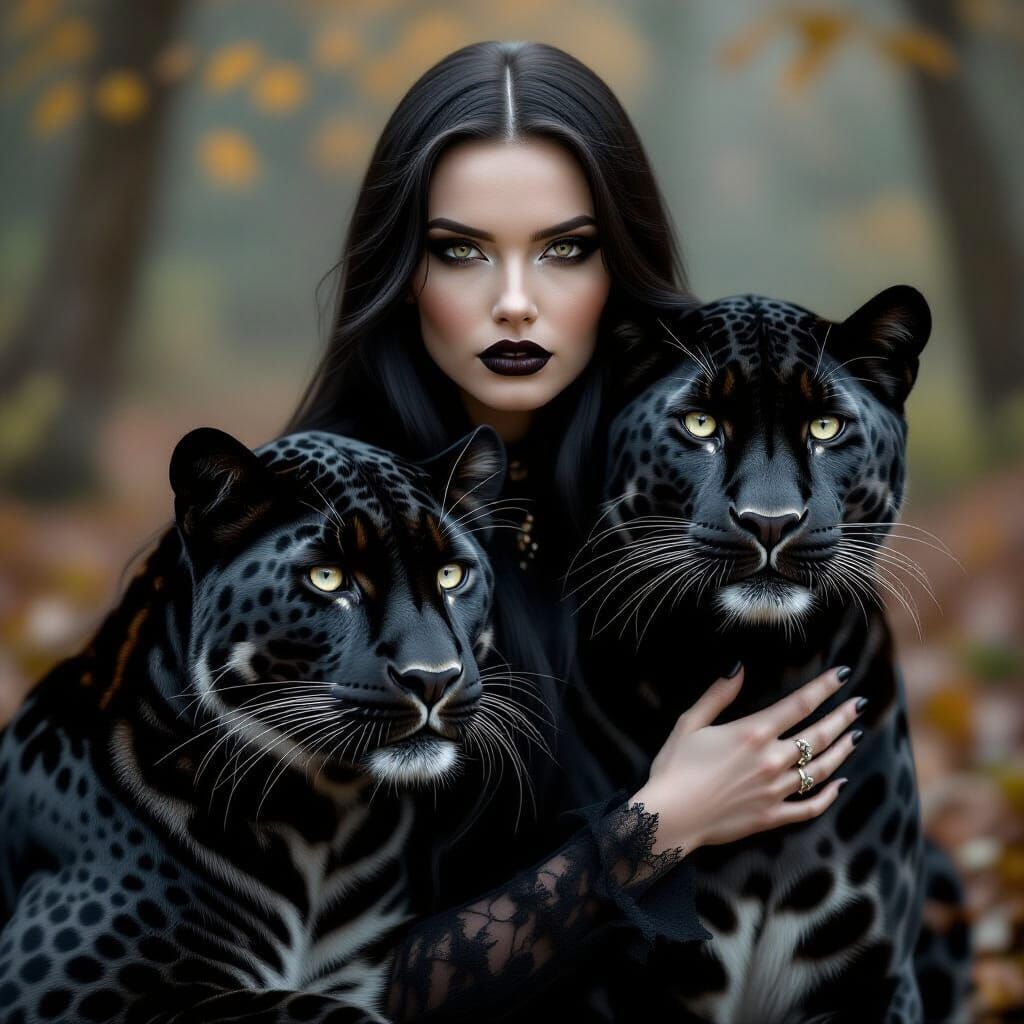 A striking photorealistic image of a goth woman with pale skin and black hair, posing serenely with two black spotted leopards in a misty autumn forest. Cinematic lighting enhances the hyperdetailed scene.