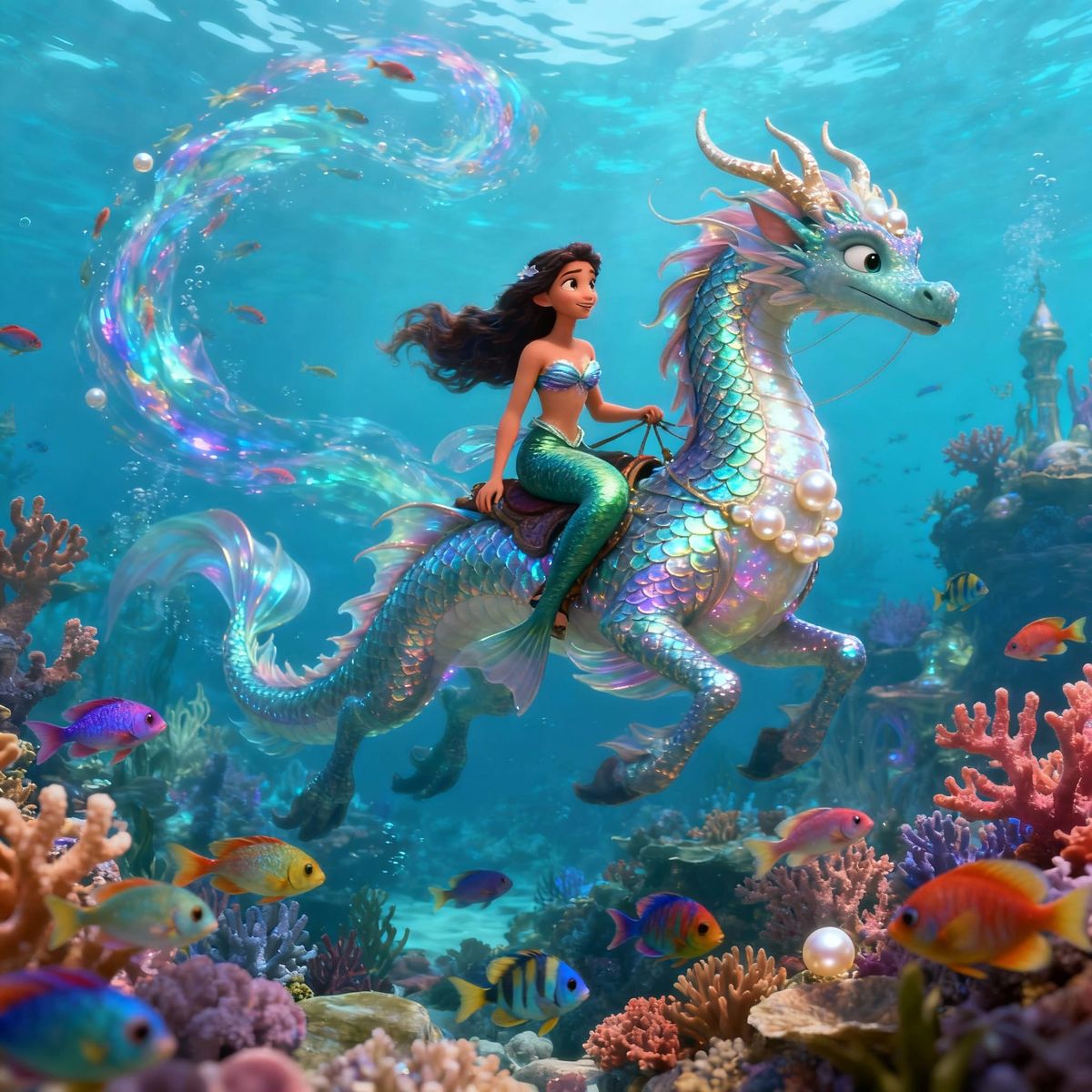 This image showcases a mermaid on a Disney-inspired sea dragon, soaring through a colorful, animated underwater realm. Features shiny scales and a dynamic, cinematic feel.
