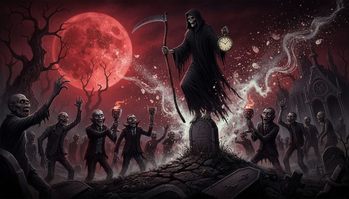 A dark fantasy concept art piece depicting the Grim Reaper, vampires, and zombies celebrating the new year in a graveyard at midnight, rendered with eerie, atmospheric lighting and deep chiaroscuro.