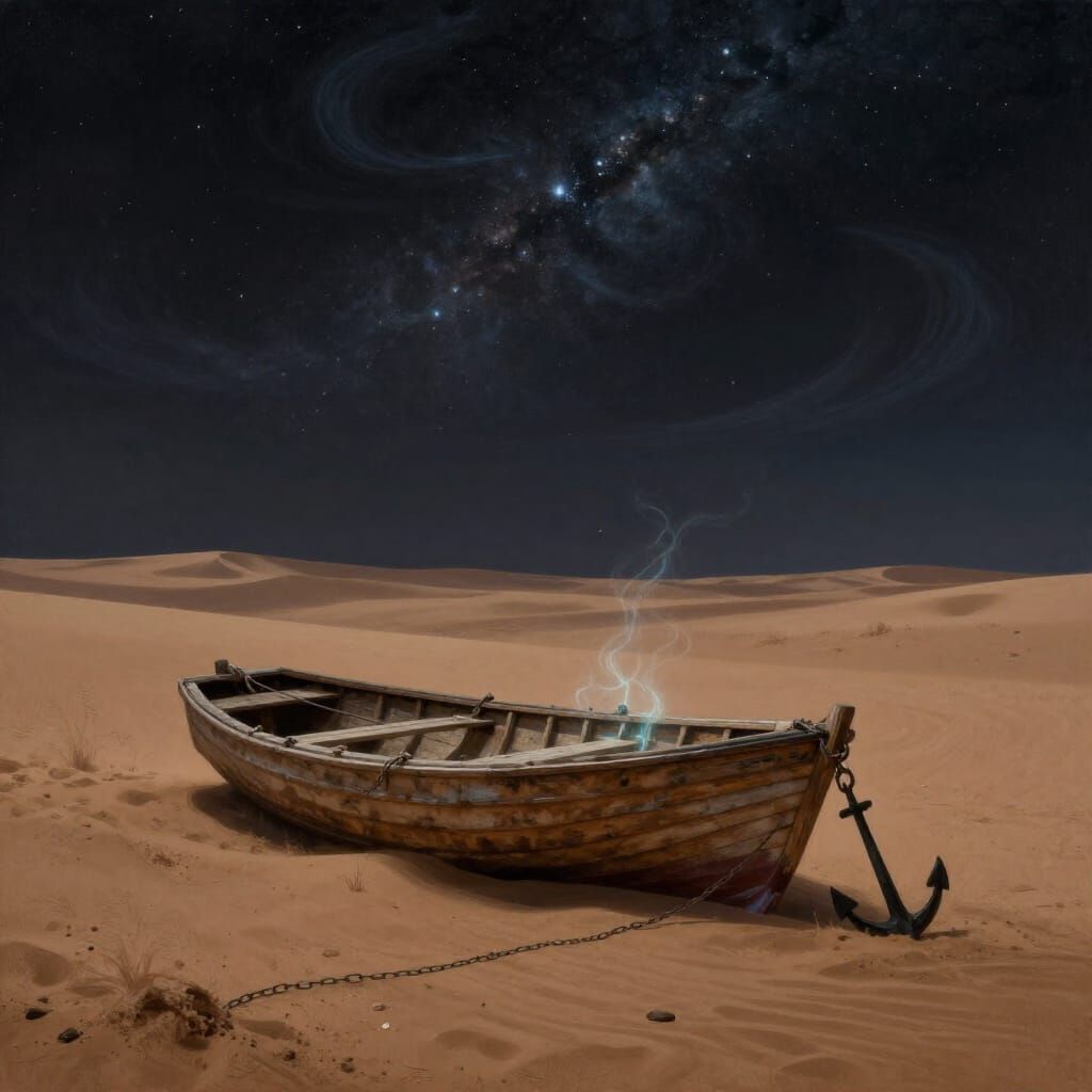 This image shows a desolate desert scene at night with a lone rowboat in the sand. Ethereal light suggests magic. Rendered as a surrealist digital painting with dramatic lighting and a dark palette.