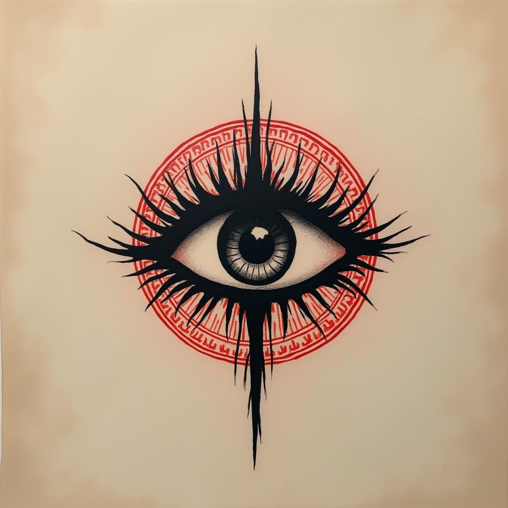 A minimalist tattoo design featuring an ancient seal with organic lines. The design symbolizes spiritual metamorphosis, incorporating a stylized eye and ritualistic mudras in black and scarlet, reminiscent of anime art styles.