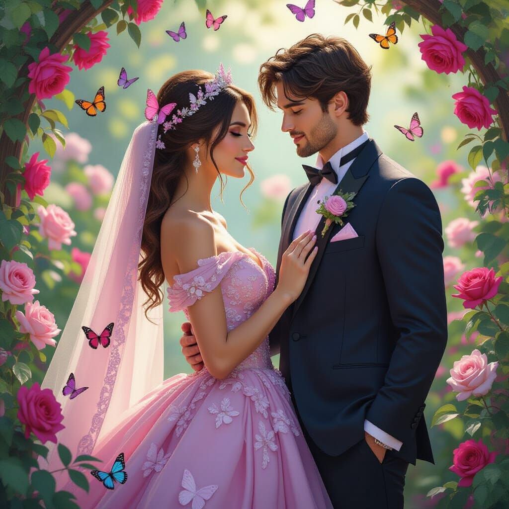 A bride in a vibrant pink wedding dress with butterflies and a groom in a tuxedo stand in a lush garden filled with roses and butterflies. Artistically inspired by Art Nouveau and romantic realism.