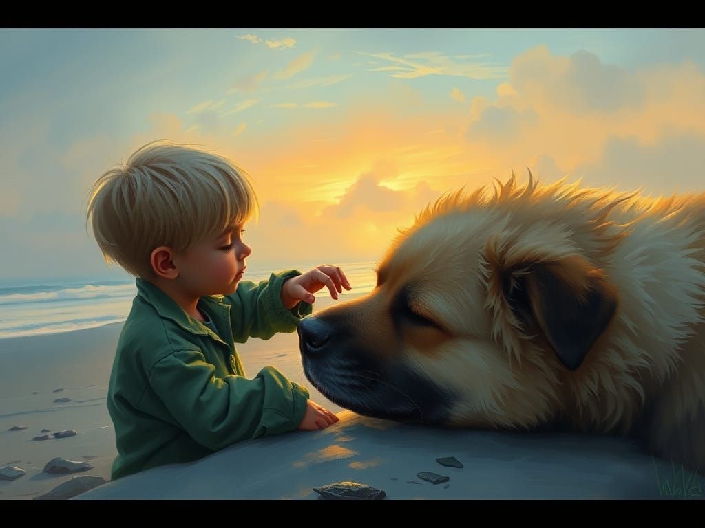 This image shows a tranquil sunset beach scene. A young boy in simple clothing softly touches a sleeping fluffy dog in the hazy evening light. The artwork is rendered in an impressionistic style.