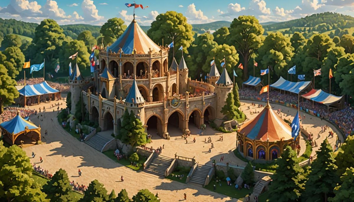 This image shows an animal Olympics pole vault competition in a medieval arena. Humans and anthropomorphic animals watch kangaroos, grasshoppers, squirrels and frogs compete in a lush landscape.