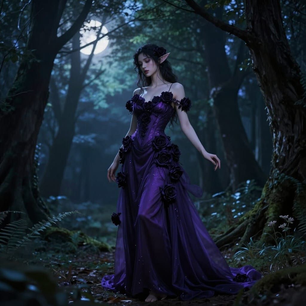 This image depicts an alluring dryad in a flowing purple nightgown with black roses, standing in a moonlit twilight forest. It features a dark fantasy art style with dramatic lighting and rich jewel tones.