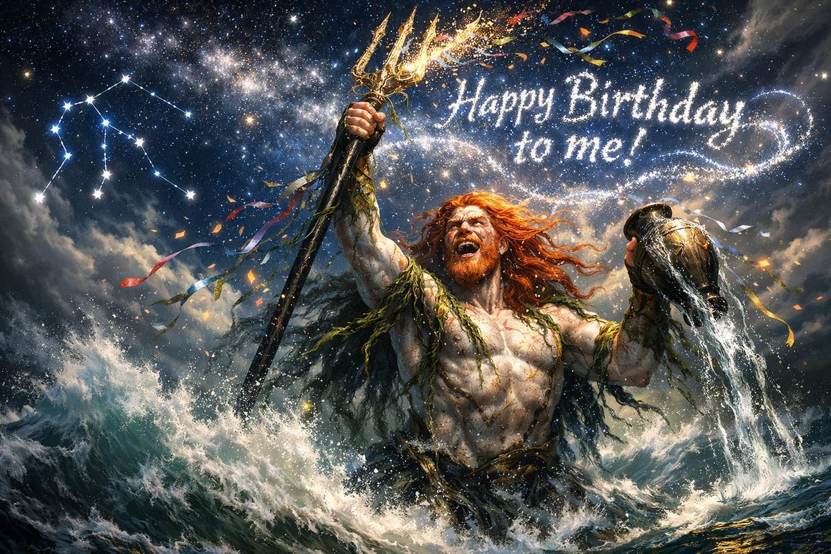 This image depicts a giant, scarred figure emerging from the sea with a trident, celebrating a birthday under a starry sky. Swirling light energy and confetti create an epic, mystical fantasy atmosphere.