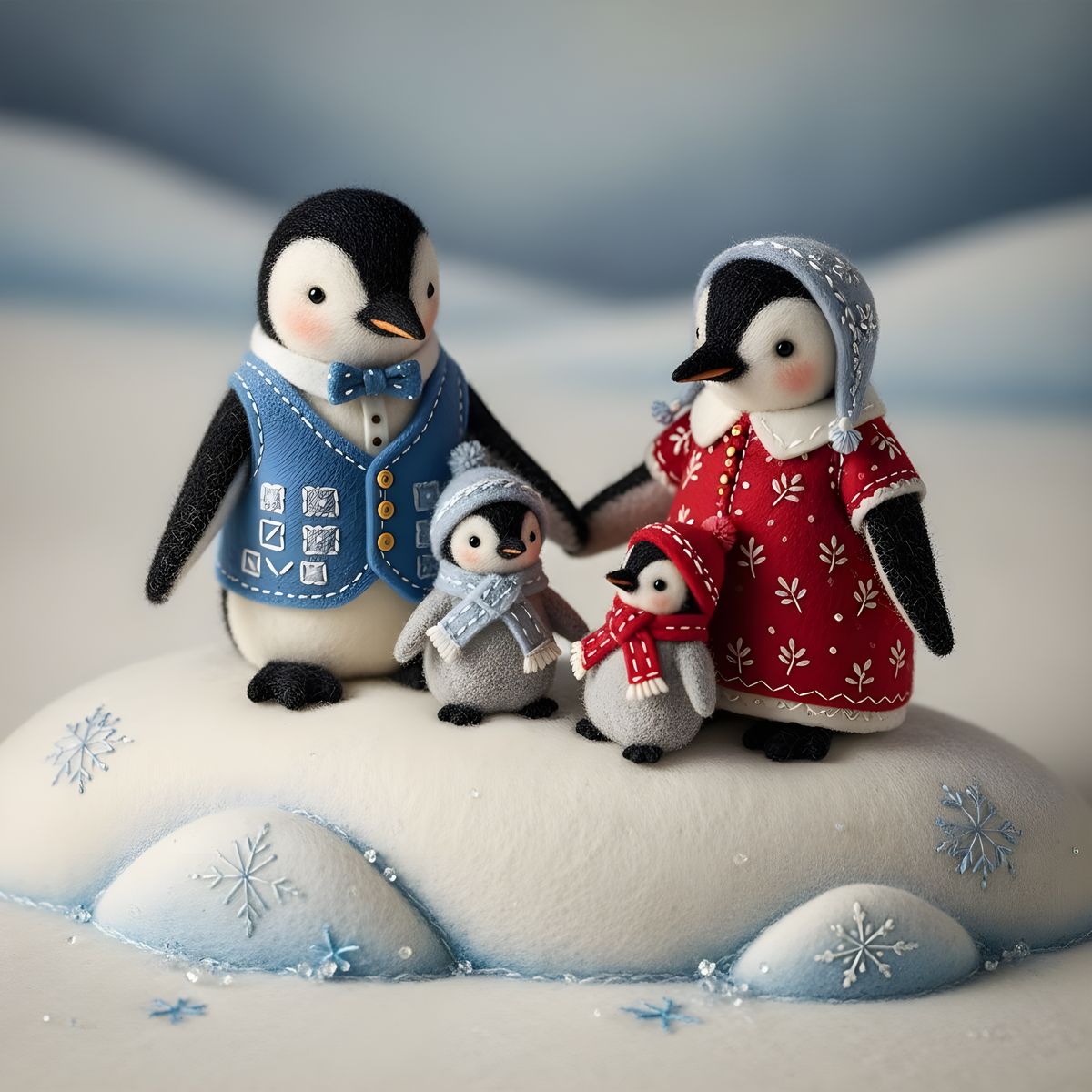 This image shows a charming penguin family crafted from felt, perched on a fluffy, white felt snowbank. A heartwarming and whimsical scene.