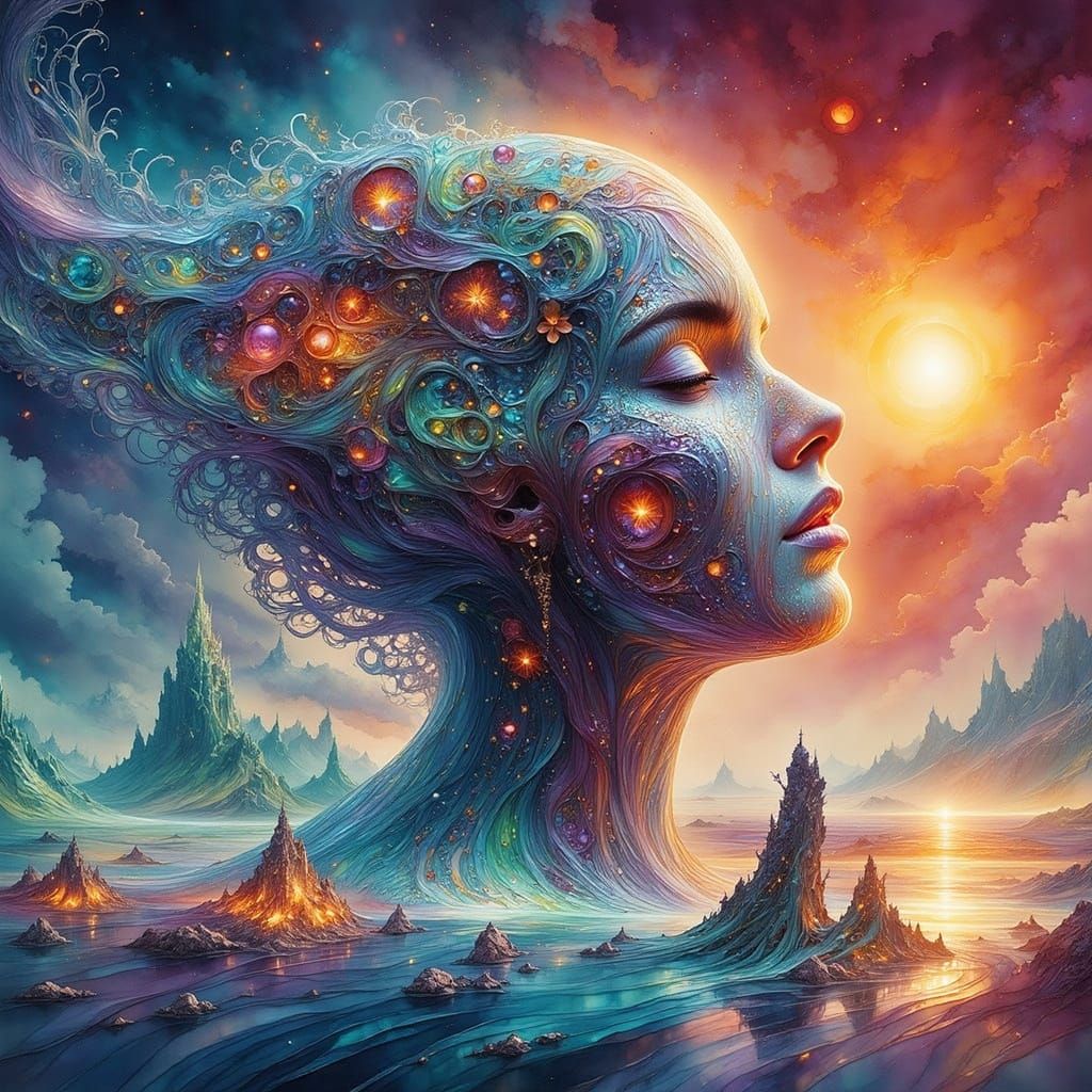 This image shows a stylish woman in vibrant neon green and orange robes, set within a futuristic dreamscape. Organic rock formations and luminous plants add to the surreal, digital art style.