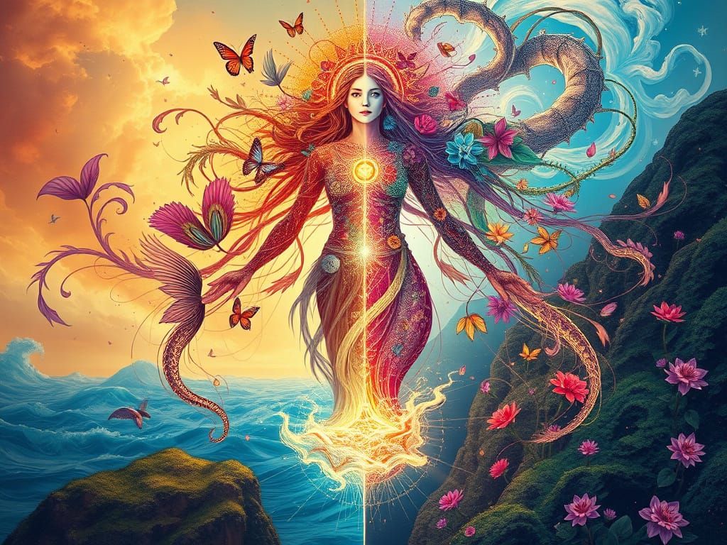This image depicts a mystical, surreal digital artwork featuring a fantastical, dreamlike scene where two contrasting worlds coexist in harmony. A goddess-like figure emerges from the sky, blending into the environment, surrounded by a vibrant, multi-layered fantasy plant kingdom and a turbulent sea, sho...