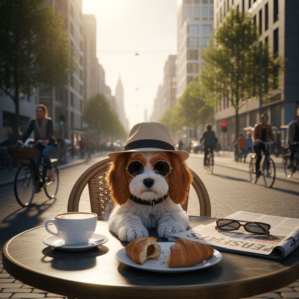 A fluffy Cavapoo dog relaxes at a cafe, wearing a fedora and sunglasses. The scene includes coffee, a croissant, and a newspaper, set in a detailed urban environment with soft lighting. The image has a retro, cinematic style.